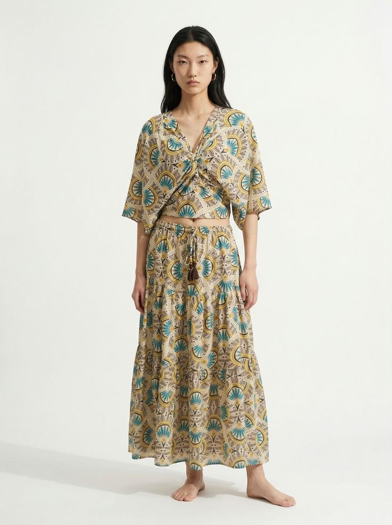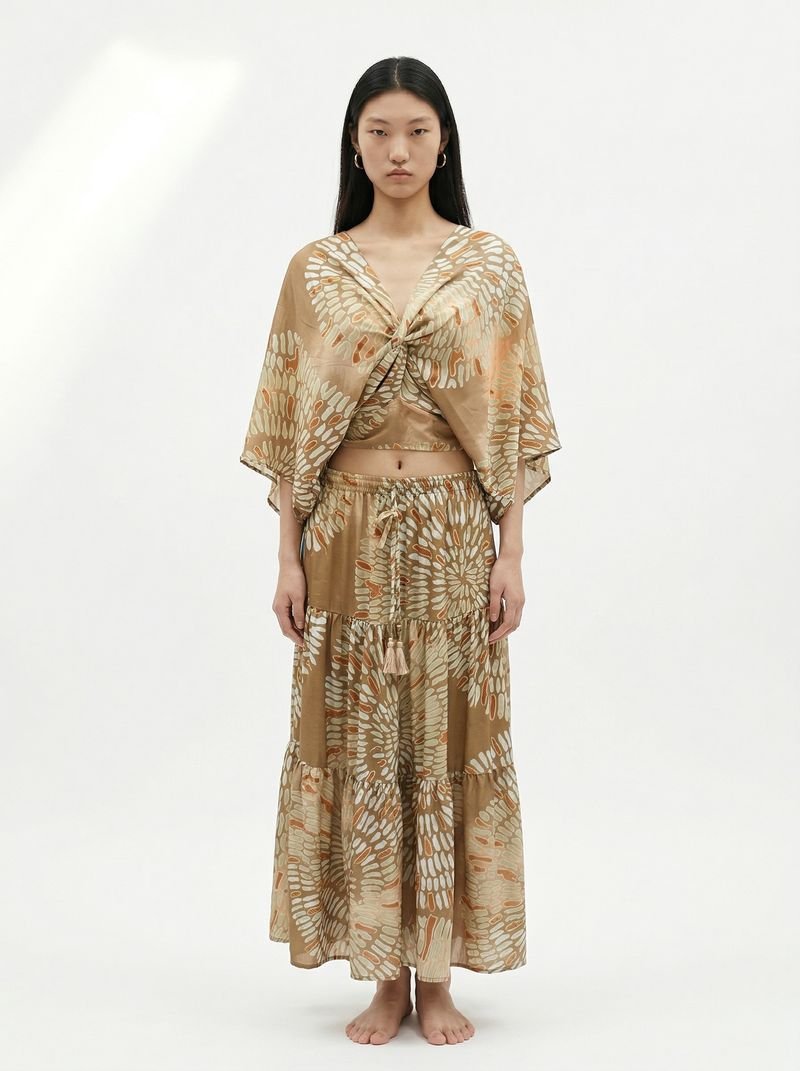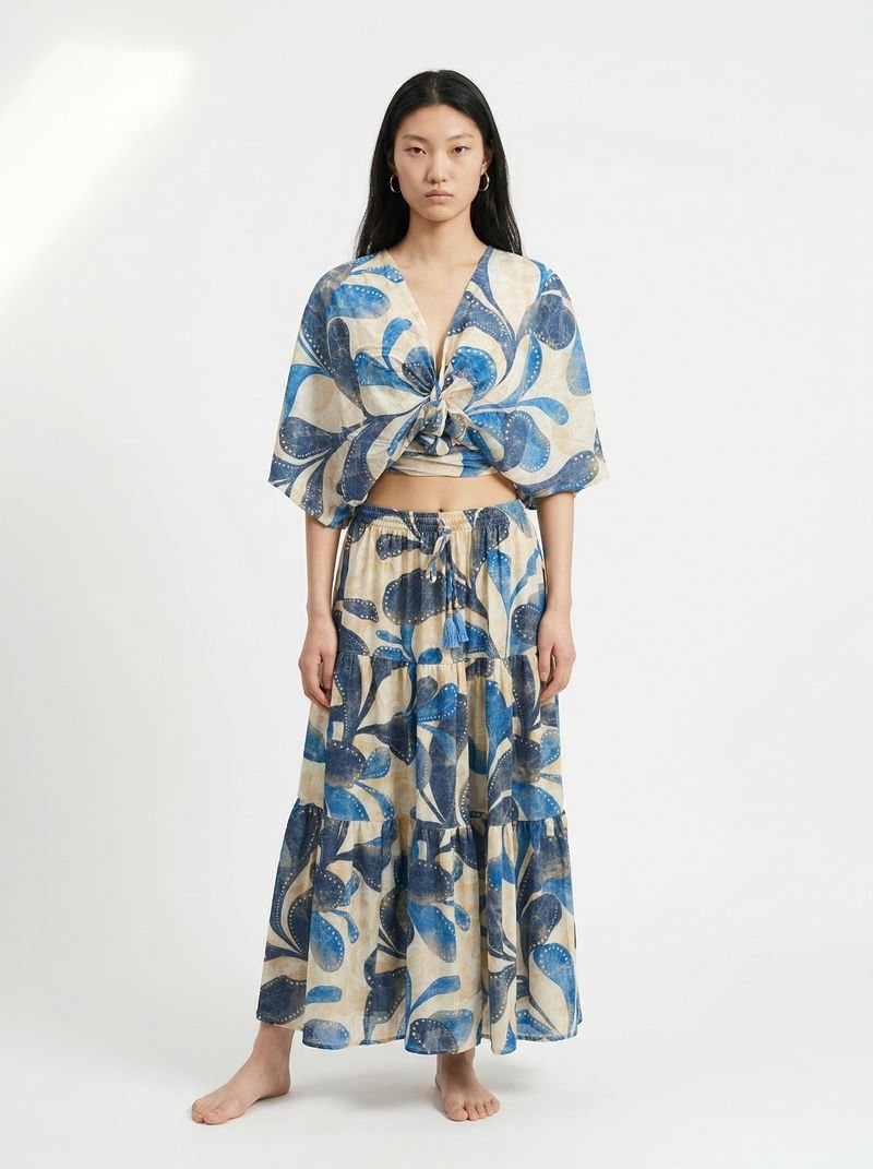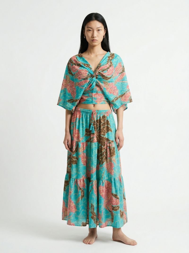 סט חצאית מקסי וחולצת בטן עם קשר מעל הטבור ושרוולים באורך מידי בידיים.