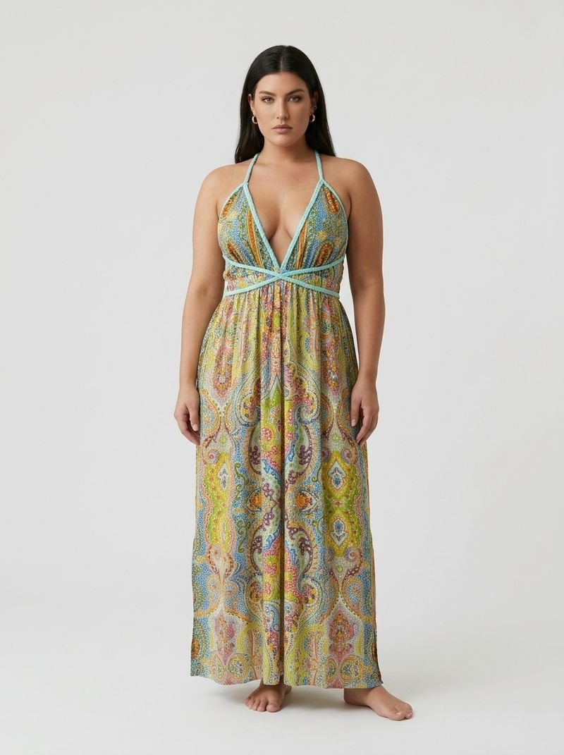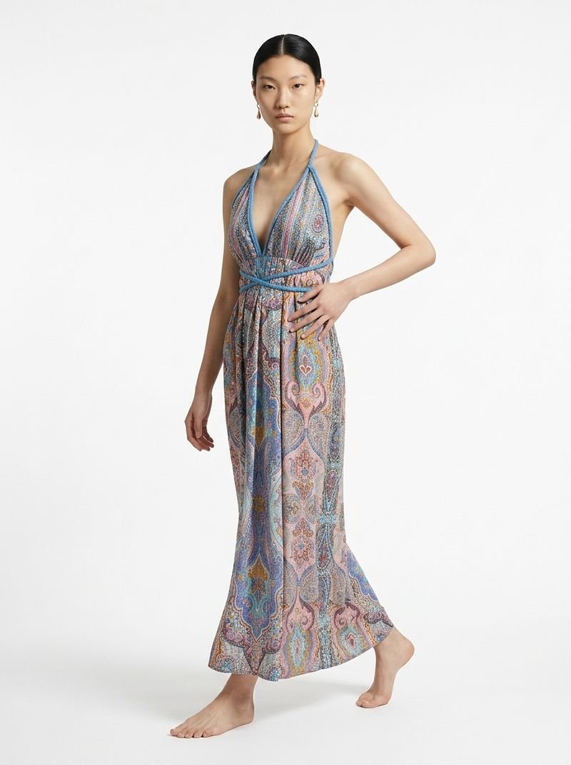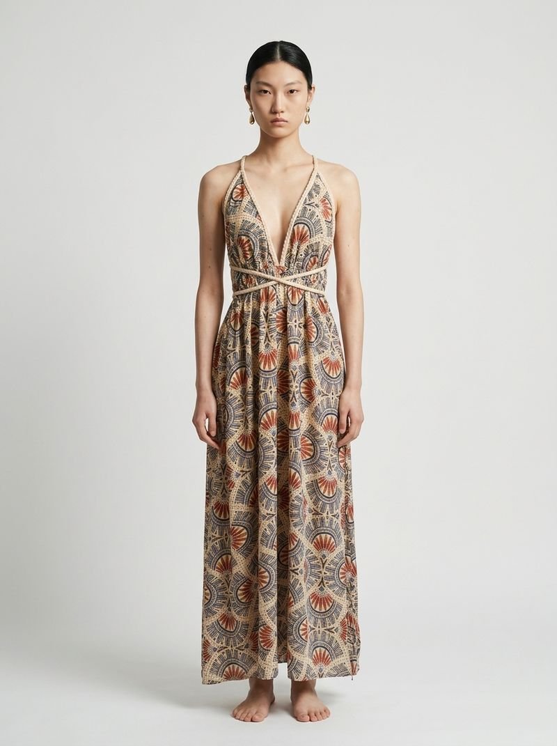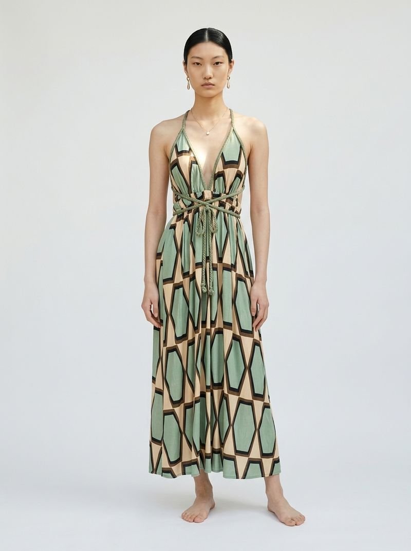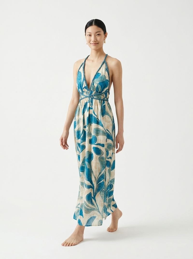 שמלת מקסי עם שרוכי צמה ארוכים היכולים לכוונן את השמלה למראה הנבחר.