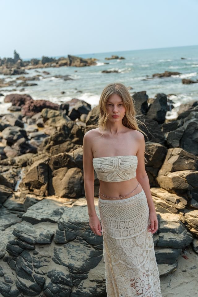 חצאית מידי מקרמה בצבע בז. בעלת הדפסים ותפירות שונות המעניקות מראה בוהו לא מתאמץ ומלא סטייל.